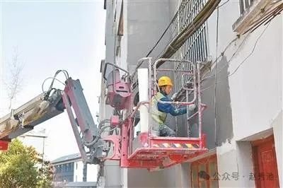 江苏省如皋市持续推进老旧小区改造,不断完善老旧小区基础配套设施。图为如皋市如城街道皋南新村四组团老旧小区改造现场,工人正在进行住宅楼外立面施工作业。吴树建摄(人民视觉)