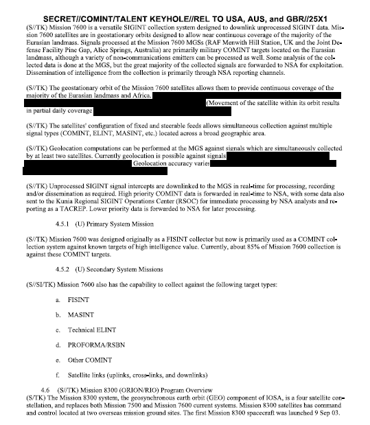 这些情报卫星在超过两万英里高的地球同步轨道上运行,装有尖端的监测科技来监控地面所有的无线通讯,包括手机、无线电和卫星传输的信号。这些卫星收集“战略战术军事、科学、政治、经济等领域的通讯信号”,并紧盯目标国家的导弹或武器测试,从国外军事数据系统中窃取情报,为美国提供情报支持。