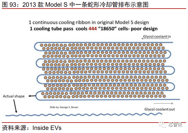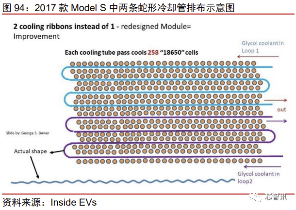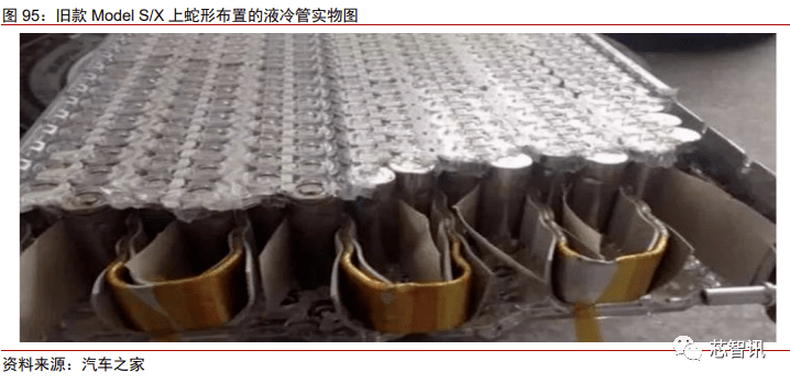 特斯拉早期的 Model S/X 电池模组中,冷却管路采用蛇形布置的冷却管,即长冷却 管穿越于整个电池模组中。如图中所示,2013 款 Model S 中采用一条蛇形冷却管,覆盖 444 颗电芯;2017 款 Model S 中采用两条蛇形冷却管,每根冷却管覆盖 258 颗电芯。
