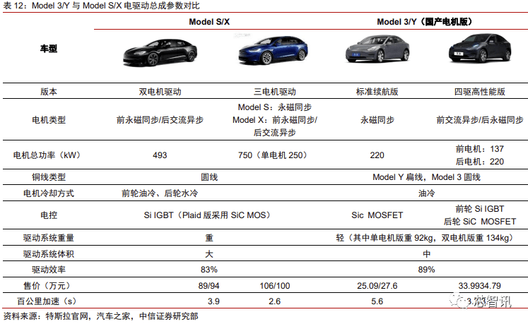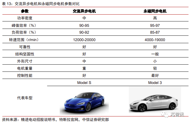 Model S/XModel 3:由感应电机转向永磁同步电机。2012 年特斯拉 Model S 上市, 该车型定位高性能(197kW),彼时大功率车用永磁电机尚未成熟。而大功率感应电机相 对成熟、成本低,且不受稀土资源制约,亦无高温下退磁的担忧。因此 Model S 搭载的是 感应电机而没有选择永磁电机。感应电机具备成本低、功率高等优势,但同时也存在体积 大、效率低而影响续航等缺点。随着电动化推进,在 2017 年推出的 Model 3 中开始转向 使用永磁同步电机。相比感应电机,永磁同步电机体积小更紧凑,效率高而有利于续航且 更易控制,在 Model Y 中,特斯拉继续亦采用永磁同步电机方案。
