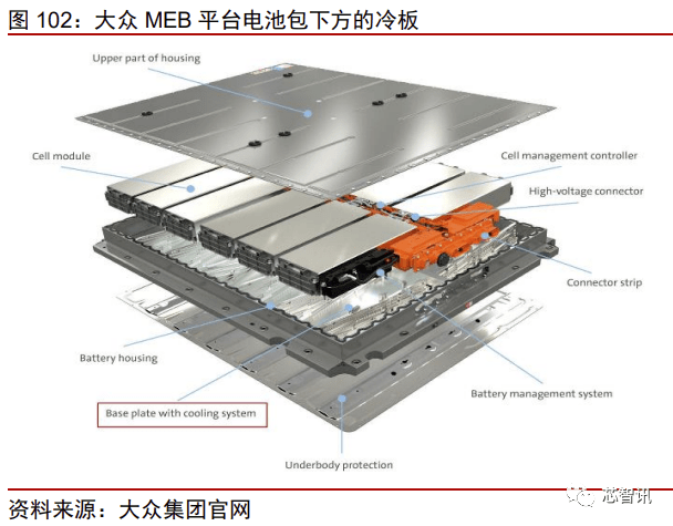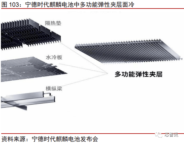 横向对比来看,国内市场电动车方案以方形为主,方形电芯方案下,主流方案是在电 池包下方铺设冷板,通过界面导热材料将电芯中的热量导至冷板,实现冷却。随着电池能 量密度、充放电功率要求的提升,对于电池冷却的需求提升,宁德时代最新发布的麒麟电 池中,将隔热垫、水冷板、横纵梁整合为一体,冷板从水平放置变为类似特斯拉冷却管的 竖直、间隔放置,换热面积扩大 4 倍,支持 4C 快充,同时起到冷却与支撑作用。