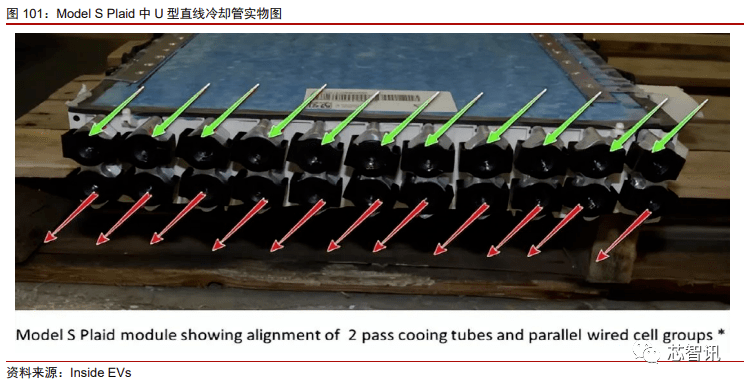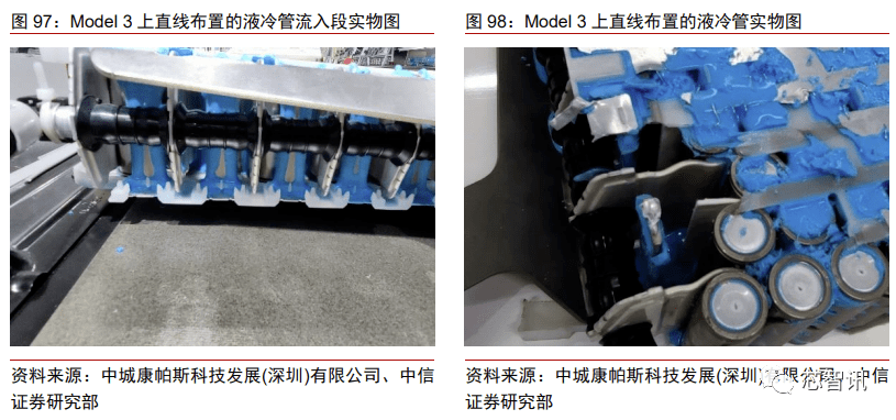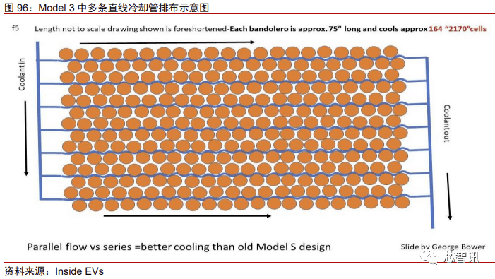 Model 3 开始,特斯拉采用直线冷却。冷却液从模组一侧分 7 根直线冷却管流入,从 另一端流出,单根冷却管覆盖 164 颗电芯。单根冷却管覆盖数减少,冷却效果更充分;冷 管长度减小,冷却更快。核心原因,一方面 Model 3 升级为大模组方案,模组内需冷却的 电芯数增加;另一方面,在快充的需求下,对于电芯更快、更充分的冷却需求提升。