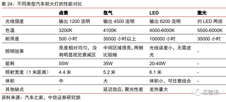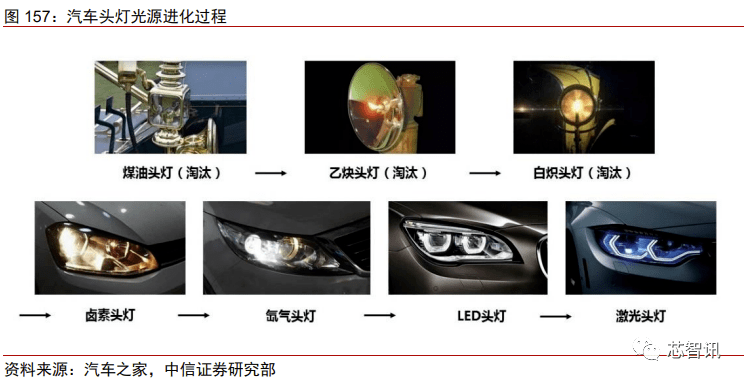 光源迭代:汽车车灯光源变得更优质、节能,体积更小。早期车灯主要煤油头灯、乙 炔头灯等明火大灯,照明效果差,且需要携带燃料,使用极为不便。20 世纪 70 年代卤素车灯面世,其照明效果远优于明火大灯,且成本便宜,迅速成为汽车车灯的主要光源。随 着车灯光源技术的进一步升级,氙气灯、LED 等照明效果更好、能耗更低的车灯光源逐渐 应用于中高端车型,并开始向中低端车型渗透。2014 年,宝马旗舰电动超跑 i8 首个搭载 激光大灯,将汽车车灯光源技术又推高到一个新的台阶。回顾车灯光源的迭代历程,每一 次光源技术的升级都伴随着光线强度、耐用度、照明效果等性能的提高以及能耗的减少。