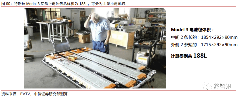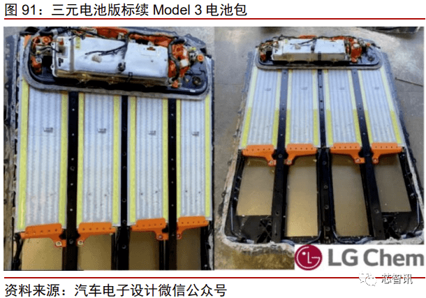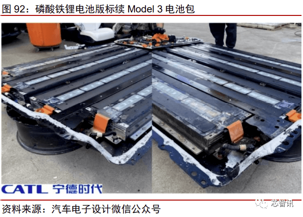 电池包空间灵活排布,兼容多材料体系。铁锂版标续 Model 3 出现之前,三元版标续 Model 3 采用不占满电池包的方式,保留长续版 188L 的电池包体积,仅占用约 3/4 的电池 包空间,放入 53kWh 电池;切换到铁锂版标续 Model 3 后,用磷酸铁锂电芯将电池包空 间全部填满,由于磷酸铁锂电芯的能量密度低于三元电芯,对应带电量 55kWh,达到与此 前三元版标续 Model 3 相同的续航能力。