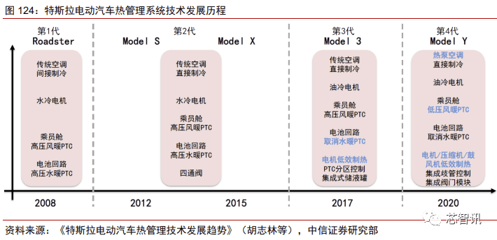 技术持续创新,特斯拉热管理系统集成逐渐深化。综合来看,特斯拉热管理通过四通 阀、集成式储液罐、热泵系统和八通阀等技术创新,实现结构集成,提升了系统的能量利 用效率。以加热方式为例,特斯拉从仅利用电池电能产热(PTC),到利用电池产热+利用 电机电控余热,再到电池产热+车内各可产热的部件+环境产热,通过整车热源集成及技术 升级完善热能利用。