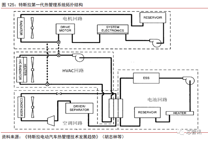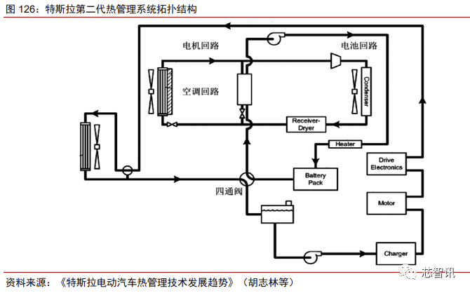 特斯拉第一代热管理系统不同回路相对独立。特斯拉第一代热管理系统应用于 Tesla Roadster 车型,包含电机回路、电池回路、HVAC(空调暖通)回路和空调回路,各回路相对独立,与传统内燃机汽车架构类似。电机回路上布置驱动电机、电子控制单元、电子水泵、膨胀水箱等,对电机回路上电子部件进行散热。电池回路上布置动力电池、热交换器、膨胀水箱、高压 PTC 等,实现高低温下电池性能的稳定。HVAC 回路布置散热器、高 压 PTC 等,调节乘员舱温度。空调系统布置压缩机、冷凝器、膨胀阀和热交换器等,通过压缩机进行制冷循环,并通过热交换器对系统回路和 HVAC 回路进行制冷。