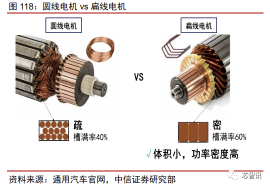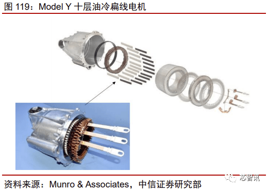 Model3Model Y:由圆线向扁线切换。目前电机多为圆线电机,绕组一般采用圆形 细铜线。扁线电机相比圆线电机的优势在于:1)槽满率 20%提升可使电机体积减小;2) 宽截面使其电阻/温升减小 50%/10%左右,输出功率更高,峰值功率密度可达 4.4kW/kg, 显著高于目前圆线电机的 3.2-3.3kW/kg;3)在电机损耗中,铜耗占到 65%,而在扁线电 机中裸铜槽满率提高,有效绕组电阻降低,进而降低铜损耗。
