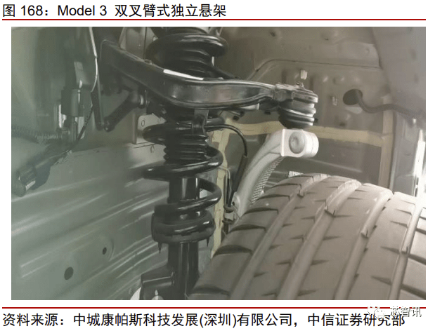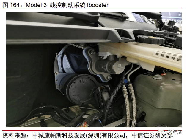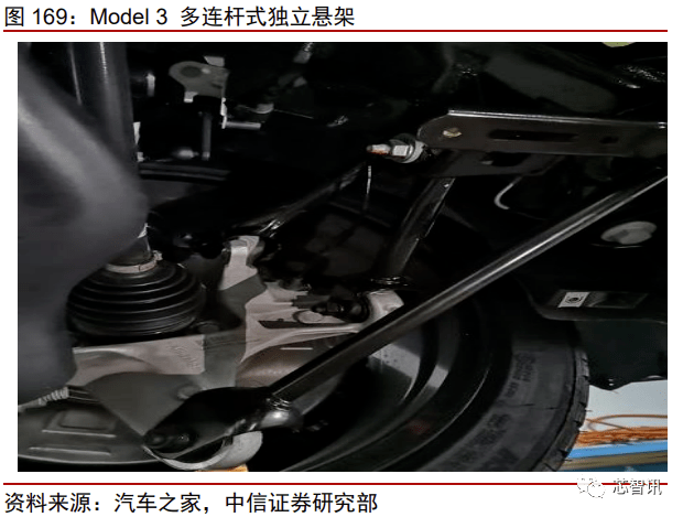 Model 3 底盘逐步实现线控化。经过对 Model 3 底盘结构的拆解,我们看到:悬架方面,特斯拉全车型均采用前轮双叉臂式独立悬架搭配后轮多连杆式独立悬架的配置,未配置空气悬架;制动系统方面,特斯拉车系使用最前沿技术,即线控制动系统 Ibooster;转 向系统方面,Model 3 仍沿用传统的电动助力转向。