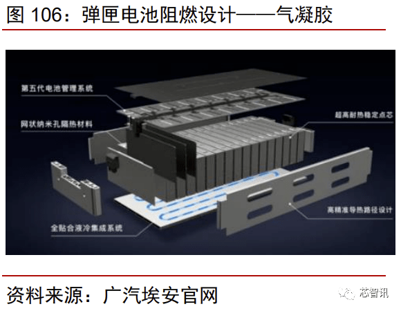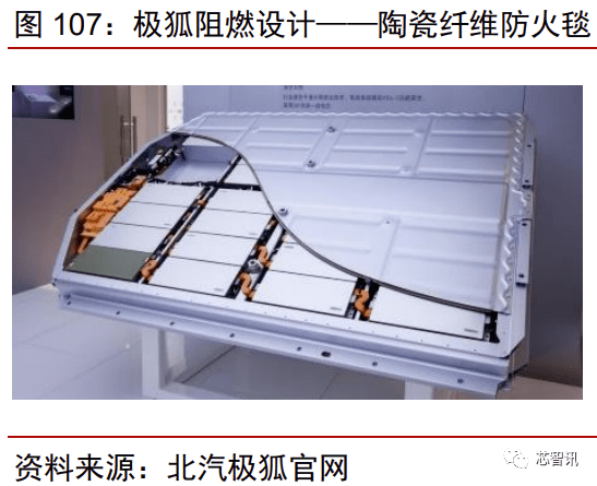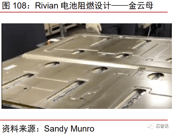 市面上多种阻燃设计方案共存,尚未达成共识。当前防火阻燃方案众多,例如凯迪拉 克 Lyriq 和广汽埃安采用气凝胶薄片隔绝电芯之间传热,同时达到轻量化的效果;极狐在 电池包上覆盖陶瓷纤维防火毯;Rivian 中采用金云母板覆盖在电池包上放;岚图的“琥珀” 和“云母”电池系统,分别对应在电池包内加入气凝胶和层状云母的方式达到隔热阻燃效果。