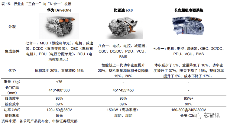 “三合一”向“N 合一”演进,电驱动系统集成度提高。随着电驱动产品集成化的进 一步提升,除电机、电机控制器、减速器驱动系统三合一集成之外,PDU、DC/DC、充电 机 OBC 等电源器件也可与其一起集成,形成功能更全的多合一动力总成系统,以提高驱动系统的功率密度并降低成本,如长安推出七合一超级电驱动系统,华为 DriveOne 七合 一系统,比亚迪 e 平台 3.0 搭载八合一电驱动系统。