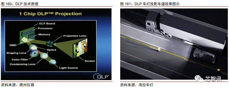 3)DLP 前灯:工作原理和投影机基本一致,就是通过镜片反射数字微镜芯片 DMD, 投射数字编辑的信息到车前的地面,像素高达百万级。由于 DLP 车灯的关键零部件数字微 型反射镜元件(Digital Micromirror Device,简称 DMD)、德州仪器的数字光处理控制器芯 片(DLPC)、功率微控制器芯片(PMIC),均由德州仪器独家垄断,成本相对较高。