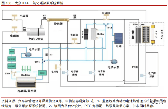 搭载二氧化碳热泵和水路热力阀,实现电池电机部分集成。大众汽车在 ID 系列车型 上搭载了二氧化碳热泵空调,其结构设计延用了普通热泵的结构,其架构主要采用直冷直 热架构,制冷蒸发器与热泵冷凝器直接进入乘员舱,并采用电磁阀和双向电子膨胀阀的组 合方式对制冷剂回路进行控制,配合舱内 PTC 实乘员舱温度条件。制冷剂回路使用 CO2 冷媒水路循环使用三通阀、水路热力阀连接电池和电机,利用电机余热加热电池,降低电 池制热下水路高压 PTC 需求,但制冷剂回路与冷却水路之间的交互较少,相对独立,未 采用热泵加热电池的模式。