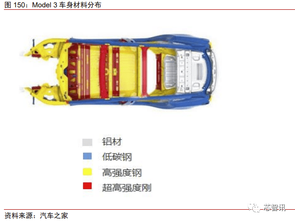 Model 3 采用钢铝混合车身,制造工艺以冲压焊接为主。经过对 Model 3 的拆解,我们发现 Model 3 车身制造工艺采用冲压焊接技术,车身材料为钢铝混合,具体分为:铝材、 低碳钢、高强度钢、超高强度钢。铝材具有低密度特性,主要集中于 Model 3 车身尾部及 壳体,以平衡车体前后重量分布。车身其余部位根据设计强度要求,采用三种不同强度的 钢铝合金,其中乘客舱骨架(车身纵梁、AB 柱、车顶纵梁、底板梁)采用强度最大的超 高强度钢,用以保护乘客安全。铝材的使用令汽车在轻量化方向上迈出重要一步。