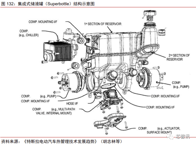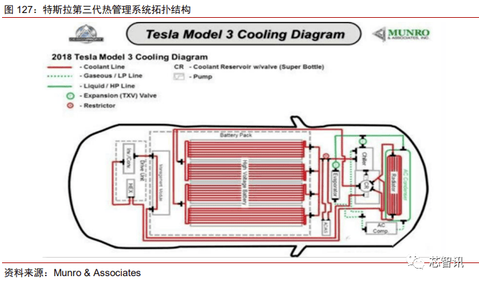 2)Superbottle:到了特斯拉第三代热管理系统,在结 构上通过Superbottle 将四通阀、散热器、水泵等集成,实现电池与功率电子管路串并联、 电池与电机回路的交互,与第二代相比则集成更多分系统。