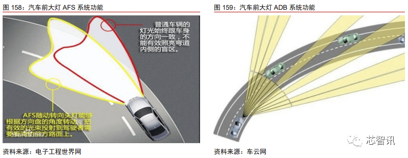 智能化升级:从 AFS 到 ADB 再到 DLP,智能化程度不断加深。汽车行驶过程中驾 驶员需要应对的环境瞬息万变,静态的汽车车灯照明很难实时满足驾驶员的观察需求。在 这一背景下,AFS(或 AFLS,Adaptive Front-lighting System)和 ADB(Adaptive Driving Beam)等技术应运而生,近两年,DLP(Digital Lighting Process,数字投影灯光)技术也 开始应用在一些车型上。