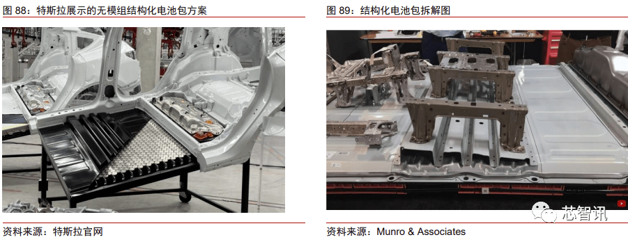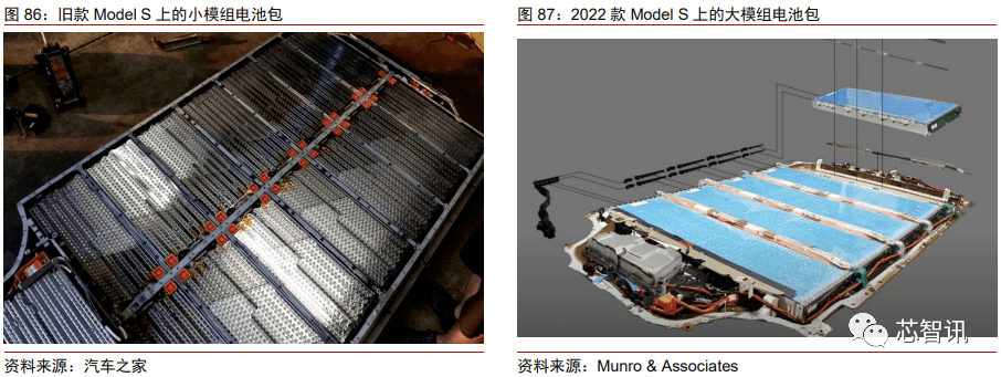 集成度提升,减少非必要零件,降低成本,提高续航里程。在旧款的 Model S 中,电 池包采用 16 个小电池模组,分模组进行电池管理;在 2022 款 Model S 中,电池包采用 5 块大模组方式集成,电池包中结构件数量减少,重量减轻,系统能量密度提升,在同样采 用 100kWh 的 1865 电池的情况下,整车续航里程从 335 英里增加至 405 英里,提升 21%;在最新的 CTC 技术中,直接由电芯作为车身的一部分,电池包上盖与车身地板融合,取 消模组设计,进一步提高系统集成效率,成本降低 6%,续航里程提高 16%。