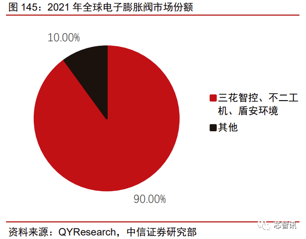 车用电子膨胀阀技术难点在于稳定性、精度要求高,同时阀件工艺存在门槛。1)稳 定性要求高:车用电子膨胀阀需安装在高速行驶、震动等相对动态场景,要求运行稳定、 耐震动、轻量化、宽温度范围适用、高可靠性和安全性,且空间紧凑,要求设计体积更小、 安装方便和可靠。2)精度要求高:车用的热管理系统比目前家用或商用空调系统更为复 杂,特别是在电池的热管理上对电子膨胀阀有更高的精度要求。3)工艺要求高:一般来 说,一只阀件由几十个精密细小的零部件构成,需 30 余个工序制作,且在制造中需满足 公差极限和测试要求,工艺要求高。受限于电子膨胀阀本身技术壁垒,全球电子膨胀阀市 场呈现寡头垄断局面,2021 年三花智控、不二工机和盾安环境电子膨胀阀份额合计约 90%。