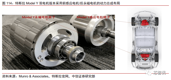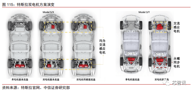 Model S/XModel 3/Y:双电机版本由前后均为感应电机向前感应后永磁电机转向。2015 年特斯拉推出双电机性能版车型 Model S P85D,在前后轴同时使用交流异步电机。而到 Model 3/Y 的四驱高性能版时,则采用了感应(前)+永磁(后)搭配的方案。主要系感应电机高效区在高速、永磁电机高效区在低速,二者搭配有互补效应。而若采用两档 永磁电机或单一大功率电机,成本高、冷却难度增加,实现技术难度较大。