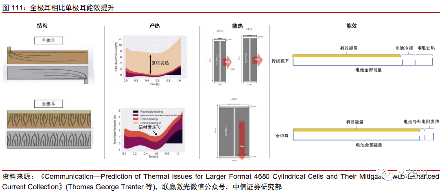 4680 搭配全极耳,提升能量密度的同时,为功率密度提升打开空间。由于全极耳比 单极耳多出两块集流盘,而小电池中集流盘占到电池体积比例更高,影响能量密度,因此 大电池更适配全极耳。在产热方面,全极耳结构的电池由于电流在集流体上流过的电流路 径更短,电阻减小而产热减小为单极耳结构的 20%;散热方面,全极耳结构电池沿径向形 成强导热路径,热管理难度与能耗降低。因此 4680 电池扩大尺寸提升容量的同时,全极耳结构减小了电阻发热和电池冷却所带来的损耗,最终电池的有效能量及能量密度增加。另外,由于全极耳产热小、散热快,为 4680 电池实现大功率快充创造了物理条件。