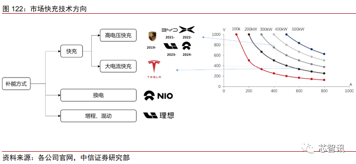 采用第三代大电流快充技术,充电功率大幅提高。快充技术有两种实现途径,一是使 用高电压提高功率,代表是保时捷 Taycan 的 800V 方案,另一种是通过大电流实现快充, 代表是特斯拉超级快充,该种方案对热管理要求较高。Model 3 配套特斯拉第三代超级快 充充电桩,采用水冷散热设计,充电过程中峰值电流为 600A,最大充电功率可达 250kW, 较 V2 充电桩峰值功率提高了 72.4%,在该功率环境中,Model 3 的 5 分钟充电量可支持 120km 续航,40 分钟 SOC 即可由 8%充至 90%。第四代超充技术或将推出,峰值电流 900A,峰值功率有望达到 350kW,将与 4680 兼容,或首先搭载 Plaid 和 Cybertruck 中。