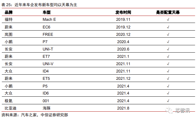 替代传统天窗,特斯拉全景天幕引领行业趋势。2016 年,特斯拉宣布旗下 Model S 和 Model 3 两大车型的最新款更换全景天幕玻璃。其中 Model 3 采用了分段式的天幕玻璃, 在车顶中部采用了加强横梁,对视野仍有一定的影响,而 Model S 和 Model Y 更是取消了中间的横梁,采用了一体式的天幕玻璃。我们认为全玻璃车顶在造型设计上更加时尚和具 有视觉冲击力,为车内提供更加广阔的视野,采光性能更好,乘坐体验提升显著。同时天幕玻璃省去电机、滑轨、齿轮等复杂结构后,制造成本更低。特斯拉所使用的天幕玻璃采 用高强度的夹层玻璃保证安全,并通过镀膜技术阻挡近 98%的紫外线和 81%的热量进入车内。特斯拉的天幕设计受到了消费者的广泛好评,料将成为未来趋势。