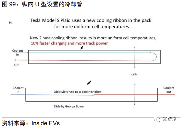 在最新的 2022 款 Model S 上,直线冷却进一步升级为 U 型直线冷却。U 型是指横向 来看,每根冷却管在竖直方向 U 型折叠,单侧流入流出;直线是指俯视来看,U 型冷却管 直线布置。纵向 U 型排布的好处是,对于不同位置的电芯的冷却效果更加均匀;直线排布 则是保持单管更少的电芯覆盖量,2022 款 Model S 模组内布置 11 根 U 型冷却管,单管覆 盖电芯数进一步下降至单管 144 颗。