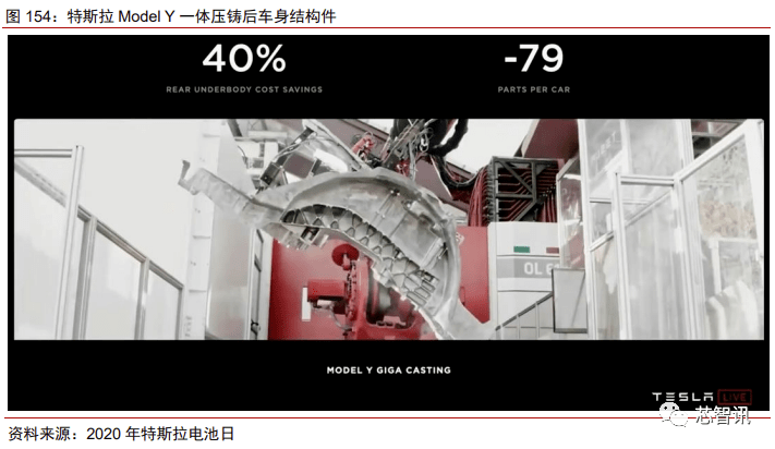 高压压铸是铝合金材料最高效的成型方法,特斯拉率先提出一体压铸。金属制品主要采用机床铣削、钣金成型焊接、铸造三种工艺生产。其中铸造主要生产内部结构复杂,难 以用钣金成型或机床铣削不具有经济性的零件。压铸全称压力铸造,是一种将金属熔液压 入钢制模具内施以高压并冷却成型的一种精密铸造法。压铸适合铸造结构复杂、薄壁、精 度要求较高、熔点比钢低的金属零件(铝、锌、铜等)。特斯拉于 2019 年率先提出一体压 铸技术制造工艺,即通过大吨位压铸机将单独、零散的零部件高度集成后一次成型压铸成 大型结构件,目前主要应用于车身结构件中。2020 年,一体铸造技术开始在 Model Y 上 应用,2021 年十月,Model Y 一体压铸前舱落地柏林工厂,Cybertruck 后地板亦将应用。