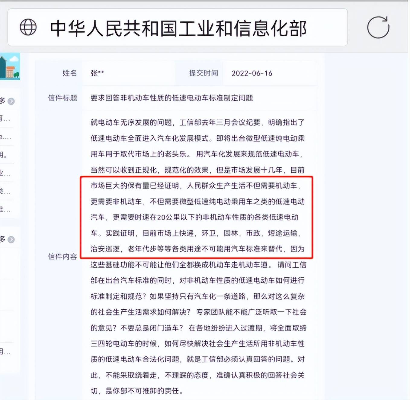 网友建议的关键原话为:人民群众生产生活不但需要机动车,更需要非机动车,不但需要微型低速纯电动乘用车之类的低速电动的电动汽车,更需要时速在20公里以下的非机动车性质的各类低速电动车,老年代步等各类用途不可能用汽车标准来替代。