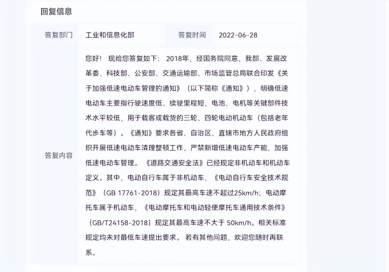 从回复的内容可以看到,并没有直接对于低速电动车到底应不应该保留非机动车的属性,而且,更为详细地介绍了低速电动车是什么,低速电动车的管理措施,以及电动车中的非机动车和机动车。