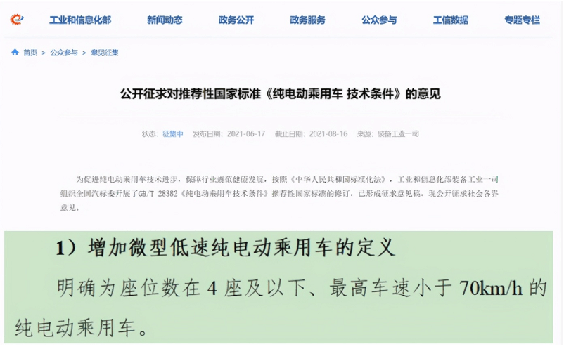 2021年6月,修订版本的《纯电动乘用车技术条件》征求意见稿和大家见面,该版本中把低速电动车定义为微型低速纯电动乘用车,纳入乘用车系列车型之一,虽然不是正式发布的标准,但也让低速电动车的管理有了一个大方向,低速电动车作为乘用车之一,将面临汽车标准管理。