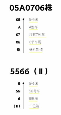 !我们车厢有人衣服被门夹到了怎么办啊啊啊。05A0706株5566Ⅱ收到,工作人员马上赶到咳咳~回到正题宝子们有没有发现一串“神奇编码”就让老铁获知了对方的车厢位置“这么神奇的吗。老铁马上带你揭开#地铁车厢上的编码秘密#列/车/的/密/码地铁列车编号信息一般分为3种1.车头及车尾的列车号2.列车内每一节车厢编号•告诉我们所处哪一趟列车,以及车厢位置3.列车的车门编号•告诉我们车厢和车门的位置#01车厢编号在车厢内每节车厢与相邻车厢之间的链接处其左上方位置有一排数字编号这个就是车厢编号啦~第1个数字代表是几号线(11号线为头两个数字)后面2个数字则表示是几号列车最后1个数字代表是几号车厢括号内株代表株机列车举个“栗”子5566Ⅱ代表的是5号线56号列车第6节车厢二位端列车编号解说图#02车门编号除了车厢编号外还有车门编号哦